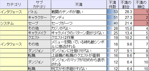 分析結果は、pdfでこのページからダウンロードできます(pdfへの直接リンクはこちら)。以下の表は、このpdf資料より不満件数多い上位10件の不満項目を抜き出したものです。