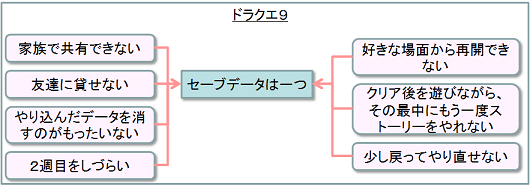 (1) ある一つのデシジョンから発生する不満: 「家族で共有できない」や「友達に貸せない」などは、「セーブデータは一つ」というデシジョンが存在すれば、直接的に発生する不満である。たとえば、以下の図に示すように、NDSのRPGである『ドラゴンクエスト9』(以下ドラクエ9)でも、「セーブデータは一つ」というデシジョンが行われた結果として 「家族で共有できない」や「友達に貸せない」といった不満が発生している。