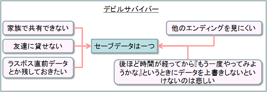 ・ある一つのデシジョンとそのデシジョンから発生する不満(図の右下):「セーブデータは一つ」というデシジョンとこのデシジョンから発生する不満