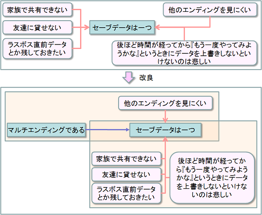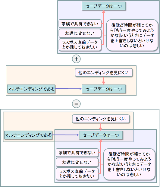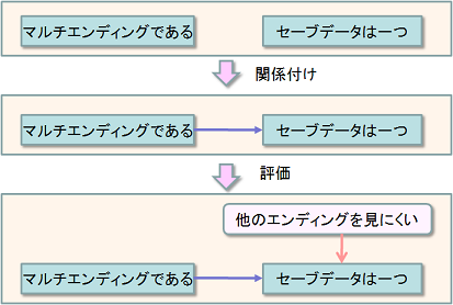 「セーブデータは一つ」に対する不満要素(「他のエンディングを見にくい」)関係付け(案1)であり、 「マルチエンディングである」と「セーブデータは一つ」という関係に対するの関係付け(案2)でないのは何故か?