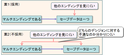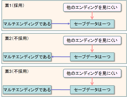 つまり、誤ったデシジョンなのは「セーブデータは一つ」であって「マルチエンディングである」ではないということである。この関係を表すために、案1を採用した。