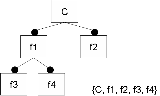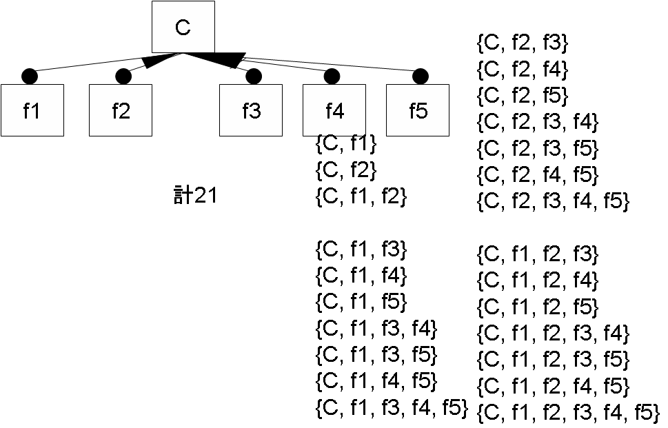 この図は、さきほどの一覧表現をフィーチャダイアグラムで表現しなおした例です。