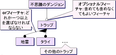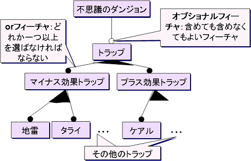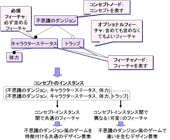 フィーチャダイアグラムは、このようなあるコンセプト(例では不思議のダンジョン)の共通部分(共通性)と異なる部分(可変性)をグラフィカルに表現する記法の一つ。