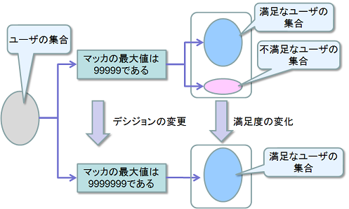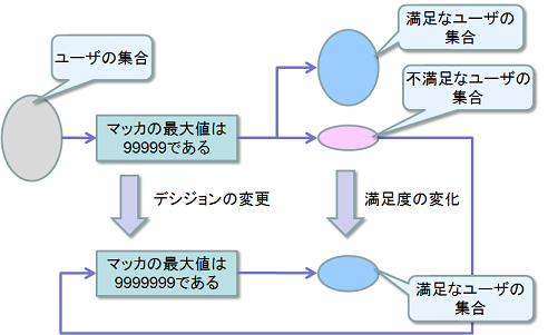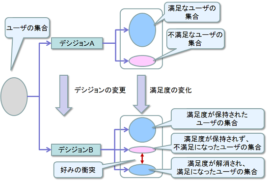 (2)ユーザ満足を保持しないデシジョン変更: あるデシジョンAからBの変更は、デシジョンAで満足していた(一部の)ユーザを不満足にし、満足していなかった(一部の)ユーザを満足させる。この場合、ユーザ間に好みの衝突が発生したといえる。