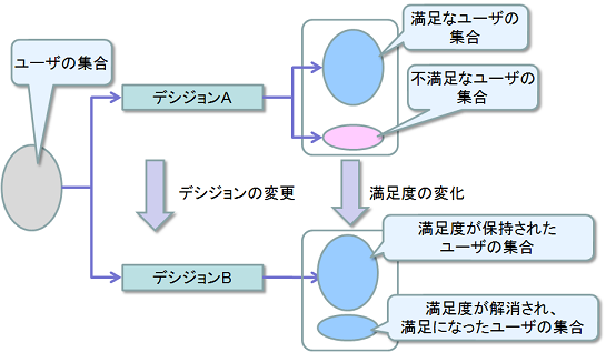 (1)ユーザ満足を保持するデシジョン変更: あるデシジョンAからBの変更は、デシジョンAで満足していたユーザを満足させたまま、満足していなかった(一部の)ユーザを満足させる。