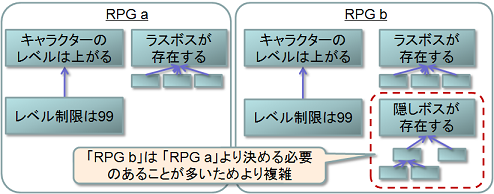たとえば、以下の図では、「RPG b」は「RPG a」より複雑である。bは、aにはない「隠しボスが存在する」という要素(決めたこと)を備える。