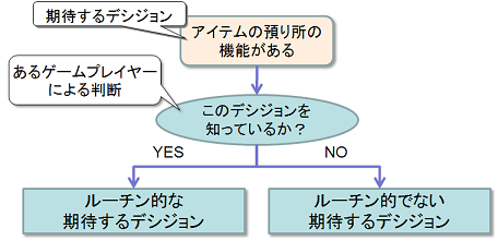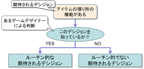 ここで重要なのは、二つの種類のデシジョンが存在するということである。つまり「ゲームデザイナーが行った実際のデシジョン」と「ゲームプレイヤーが期待するデシジョン」である。これまでのデシジョンがルーチン的かどうかの区別は、前者、つまり「ゲームデザイナーが行った実際のデシジョン」を対象としてきた。しかし、「ゲームプレイヤーが期待するデシジョン」もルーチン的かどうかで区別することもできる。