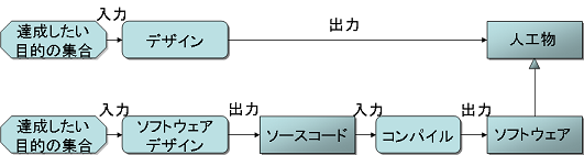 しかし、この図は、実際に我々がソフトウェアを作るプロセスの観点からは受け入れにくい部分がある。たとえば、ソフトウェアは、ソースコードをコンパイルするようなプロセスを含む。この場合、コンパイルのプロセスをソフトウェアデザインのプロセスの一部と見なしてしまう。
