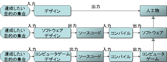 人工物、ソフトウェア、コンピュータゲームの分類を基に、次に、デザイン(のプロセス)について考えたい。ここでは、デザインを「達成したい目的の集合」を満たすような機能を備える「人工物」を作るプロセスとして定義する。この定義は、従来のデザインの定義より広い意味で使っているため、受け入れにくいかもしれない。