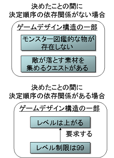 (考察1)「決めたこと1」と「決めたこと2」の間には、決定順序の依存関係が要求されない: 「モンスター図鑑的な物が存在しない」という決定をするためには、「敵が落とす素材を集めるクエストがある」という決定を先に行なわれていなくてもよい。逆も同様であり、「敵が落とす素材を集めるクエストがある」という決定をするためには、「モンスター図鑑的な物が存在しない」とう決定を先に行なわれていなくてもよい。これは、「ゲームデザインの構造とは何か?」の節で例にしたような、「レベル制限は99」という決定は「キャラクターのレベルは上がる」という決定が先になされていなければならない、という関係とは異なる。