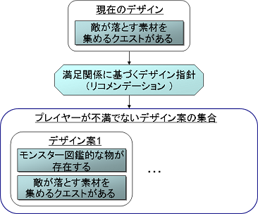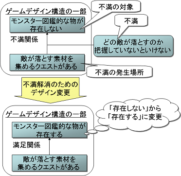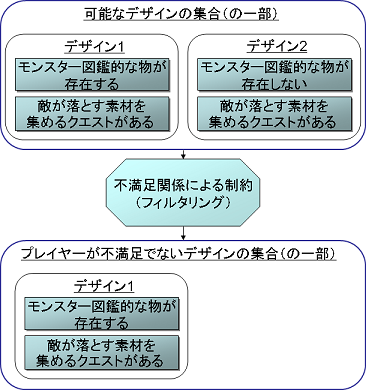 (結論2)ある決めたことに対して、0以上の満足関係がありうる: 「敵が落とす素材を集めるクエストがある」という決定には、「モンスター図鑑的な物が存在する」という決定との満足関係がある。ただし、「モンスター図鑑 的な物が存在する」という決定以外との満足関係も考えられる。たとえば、「敵が落とす素材を集めるクエストを受けている場合には、マップ上にその素材を落 す敵の情報が直接表示される」といった決定である。