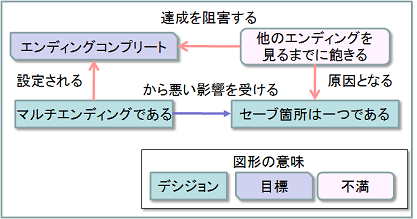 ・デシジョン間の関係とその関係から発生する不満(図の左上):「セーブデータは一つ」と「マルチエンディングである」というデシジョンと、これらのデシジョンの関係から発生する不満