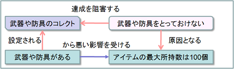 (4) 目標を阻害するデシジョン: 「武器や防具のコレクト」という目標は、「アイテムの最大所持数は100個」というデシジョンが存在することにより、達成が不可能になる。