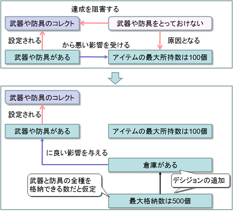 この再デザインでは、プレイヤーの提案を採用し「倉庫がある」というデシジョンを追加した。また「最大格納数は500個」というデシジョンも追加した。これらのデシジョンにより、「武器や防具のコレクト」という目標の達成が容易になる。